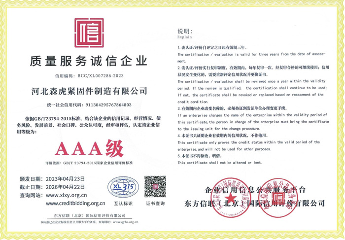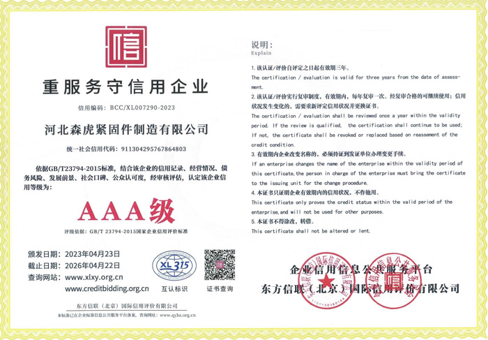 河北森虎緊固件制造有限公司成立于2011年,是建廠較早的緊固件企業(yè)。西臨京廣線,東臨京深高速,地理位置優(yōu)越,交通便利。 主要生產(chǎn):化學(xué)錨栓、機(jī)械錨栓、定型化學(xué)錨栓、高強(qiáng)度8.8級(jí)化學(xué)錨栓、自切底機(jī)械錨栓、車(chē)修壁虎,膨脹螺栓,植筋膠。 質(zhì)量方針:先進(jìn)技術(shù)、科學(xué)管理、優(yōu)良品質(zhì)、用戶(hù)滿(mǎn)意; ...資質(zhì)榮譽(yù)
